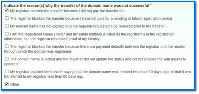 2、Indicate the reason(s) 选择投诉的问题类型,选域名转移中遇到的相关的问题。