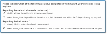 3、Please indicate which of the following you have completed in working with your current or losing registrar: 请说明当前域名转移处理情况,这里分两个部分选择相应问题说明